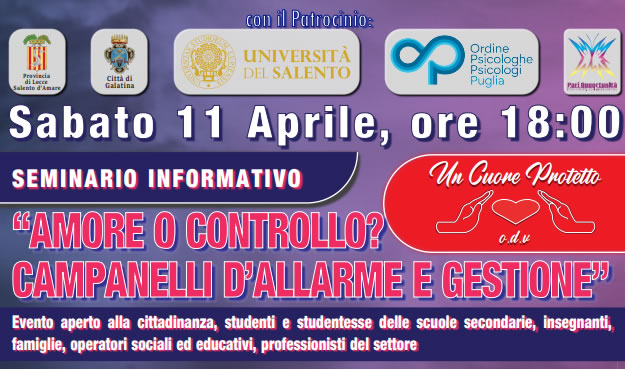 L’iniziativa è promossa dall’associazione Un Cuore Protetto OdV, con il patrocinio della Provincia di Lecce, del Comune di Galatina, dell’Università del Salento, dell’Ordine degli Psicologi della Regione Puglia e della Commissione Pari Opportunità.