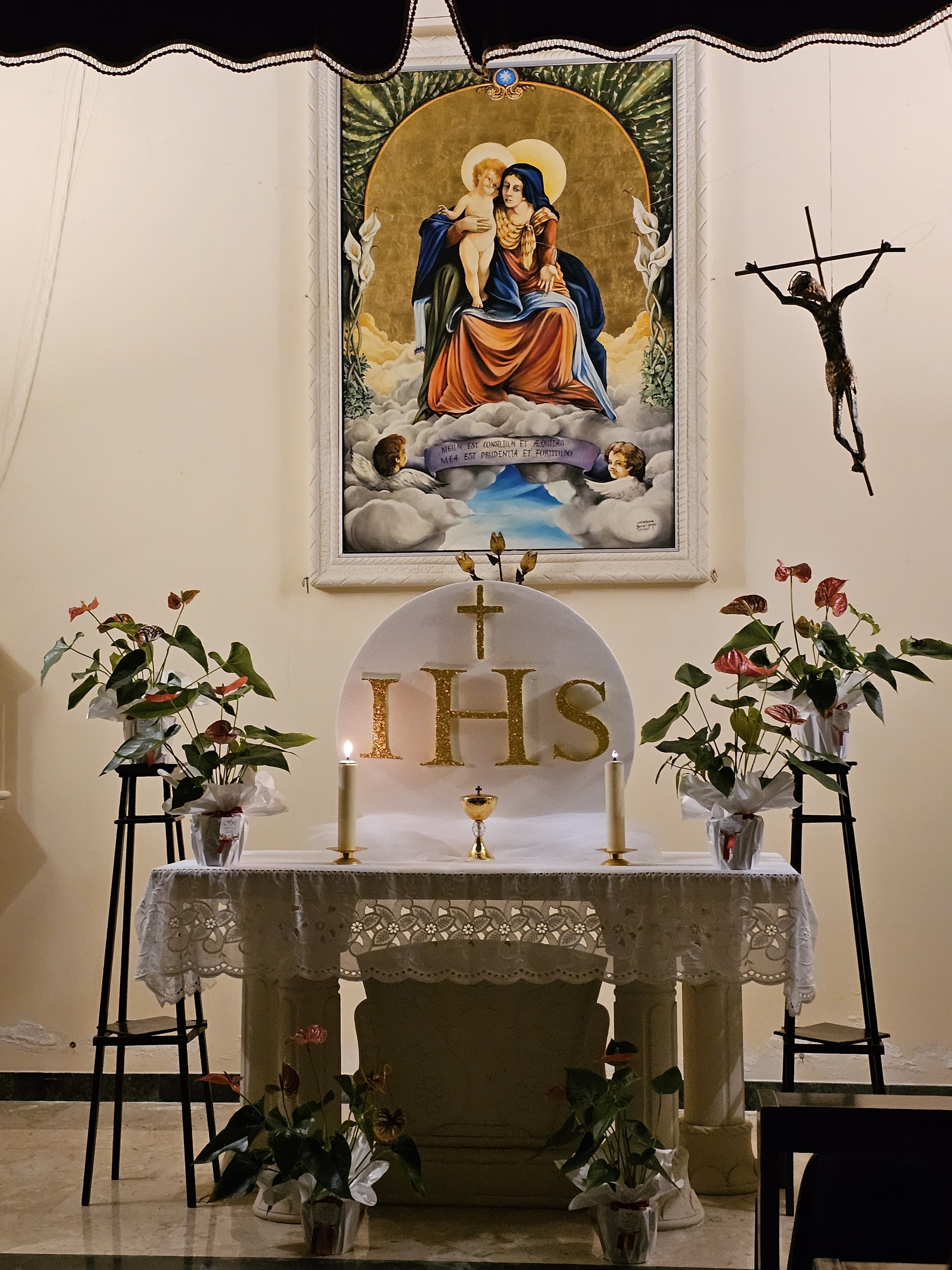e nella Chiesa Madonna del Buon Consiglio (una pisside al centro dell'altare/tabernacolo e allo sfondo l'icona JHS e in alto la Croce sospesa);