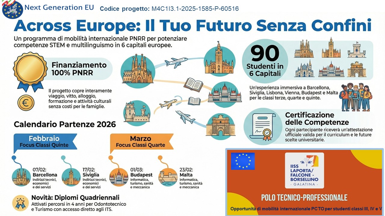Un ponte verso l'Europa, un'opportunità senza costi per le famiglie. È la straordinaria proposta formativa che l'IISS LAPORTA/FALCONE-BORSELLINO di Galatina rivolge ai propri studenti e studentesse delle classi terze, quarte e quinte: "Across Europe", un progetto di mobilità internazionale PCTO (Percorsi per le Competenze Trasversali e l'Orientamento), ora Formazione Scuola/lavoro (FSL), interamente finanziato dall'Unione Europea – Next Generation EU nell'ambito del Piano Nazionale di Ripresa e Resilienza (Missione 4, Componente 1, Investimento 3.1).